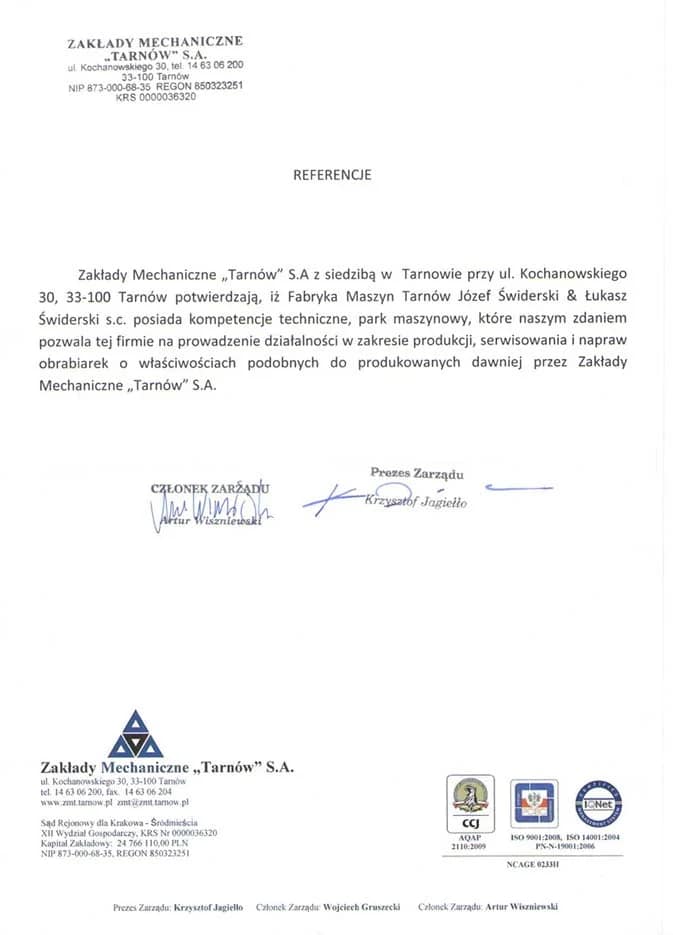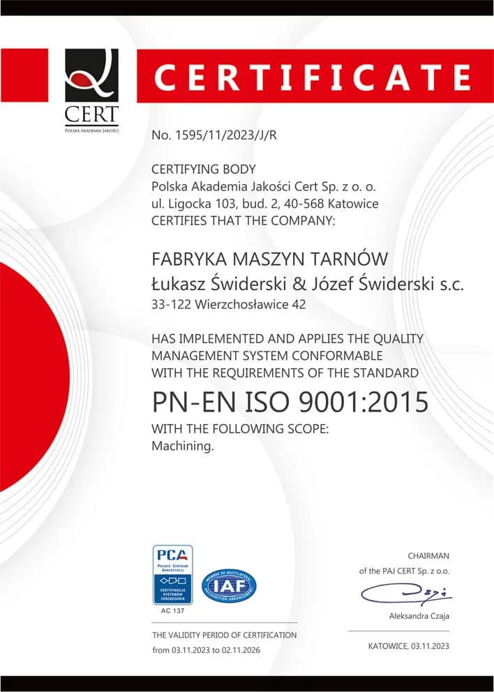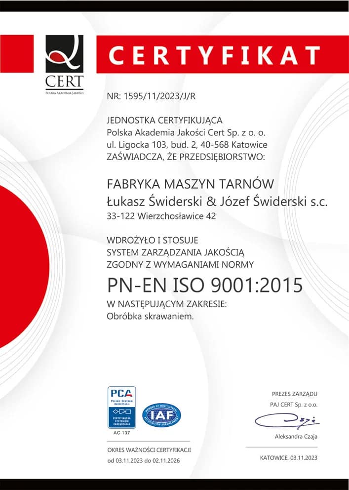 Wdrożenie Systemu Zarządzania Jakością ISO 9001:2015 potwierdza wysoki standard realizacji usług takich jak: toczenie, szlifowanie, frezowanie, toczenie CNC, frezowanie CNC oraz remonty i naprawy obrabiarek.